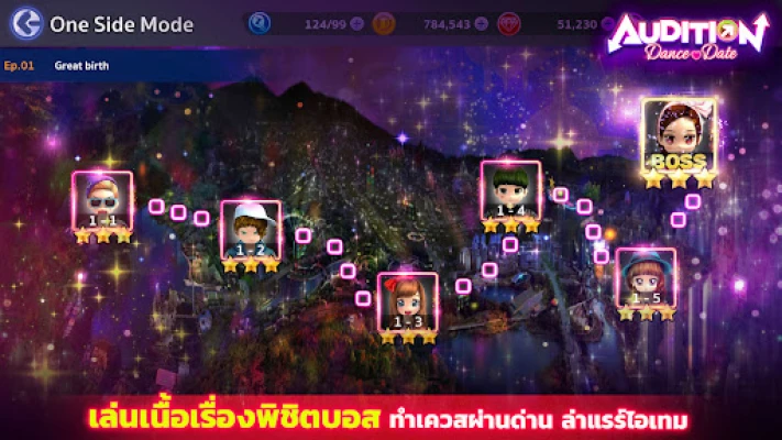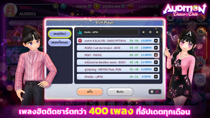 ดำดิ่งสู่ประสบการณ์การเล่นที่หลากหลายไม่รู้จบ "Audition Dance & Date" นำเสนอโหมดการเต้นที่ไม่เหมือนใครกว่าเก้าแบบ ตอบโจทย์ทุกสไตล์ ตั้งแต่จังหวะคลาสสิกที่คุ้นเคย การท้าทายความเร็วในโหมด Beat Up ไปจนถึงการเต้นคู่สุดโรแมนติก หรือปาร์ตี้คลับสุดเหวี่ยง ไม่เพียงเท่านั้น คุณยังสามารถผจญภัยในโหมดเนื้อเรื่องสุดเข้มข้น สร้างสรรค์อาณาจักรสวนของคุณให้งดงาม หรือให้สัตว์เลี้ยงคู่ใจเต้นอัตโนมัติ ช่วยให้ทุกการแสดงเป็นไปอย่างราบรื่นไร้ที่ติ และไม่พลาดทุกเพลงฮิตติดชาร์ต พร้อมไอเท็มแฟชั่นใหม่ ๆ ที่พร้อมให้คุณสะสมและปรับแต่งในทุกแพตช์