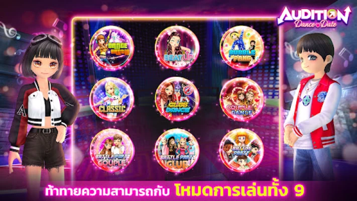 ดำดิ่งสู่ประสบการณ์การเล่นที่หลากหลายไม่รู้จบ "Audition Dance & Date" นำเสนอโหมดการเต้นที่ไม่เหมือนใครกว่าเก้าแบบ ตอบโจทย์ทุกสไตล์ ตั้งแต่จังหวะคลาสสิกที่คุ้นเคย การท้าทายความเร็วในโหมด Beat Up ไปจนถึงการเต้นคู่สุดโรแมนติก หรือปาร์ตี้คลับสุดเหวี่ยง ไม่เพียงเท่านั้น คุณยังสามารถผจญภัยในโหมดเนื้อเรื่องสุดเข้มข้น สร้างสรรค์อาณาจักรสวนของคุณให้งดงาม หรือให้สัตว์เลี้ยงคู่ใจเต้นอัตโนมัติ ช่วยให้ทุกการแสดงเป็นไปอย่างราบรื่นไร้ที่ติ และไม่พลาดทุกเพลงฮิตติดชาร์ต พร้อมไอเท็มแฟชั่นใหม่ ๆ ที่พร้อมให้คุณสะสมและปรับแต่งในทุกแพตช์